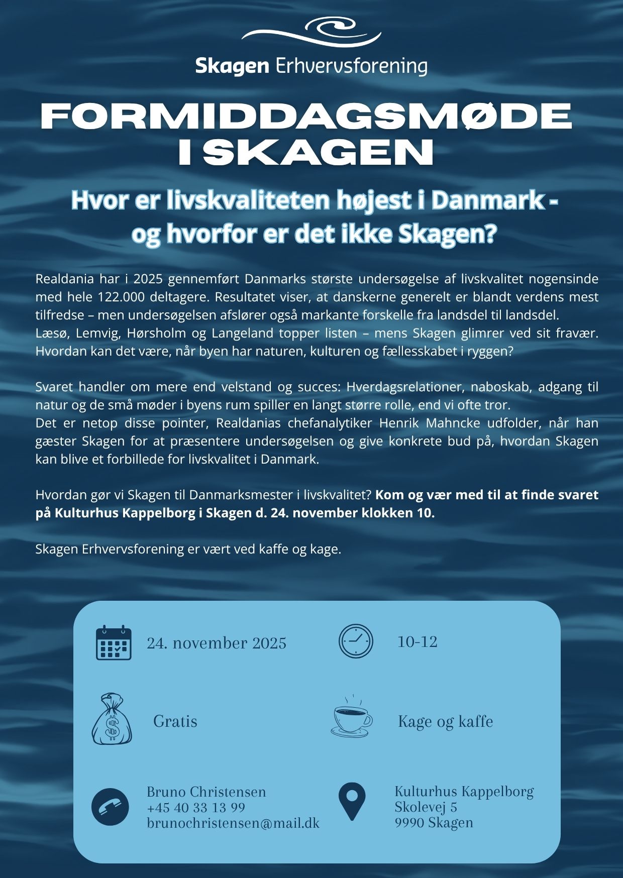 Hvordan gør vi Skagen til Danmarksmester i livskvalitet? Kom og vær med til at finde svaret på Kulturhus Kappelborg i Skagen d. 24. november klokken 10.